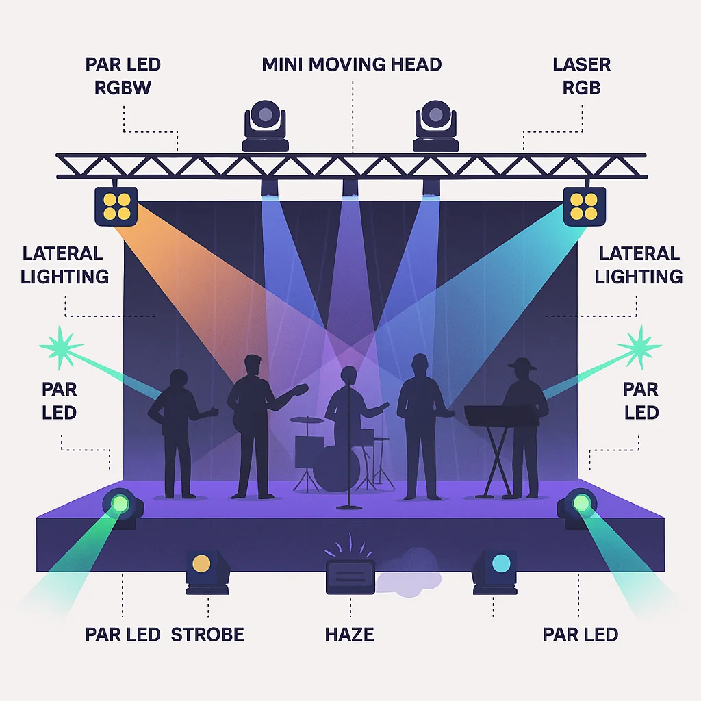 Las luces para eventos incluyen luces robóticas, cabezas móviles, luces estroboscópicas y barras LED, todas diseñadas para crear ambientes únicos.