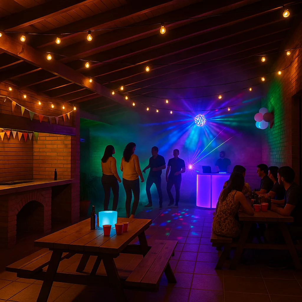 • Eventos en exteriores: Las luces resistentes al agua son ideales para jardines, terrazas y áreas al aire libre, creando un ambiente acogedor y funcional en espacios abiertospleaños**: Colores vibrantes y efectos especiales llenan de vida las celebraciones, especialmente para los más pequeños o para adultos que buscan un ambiente animado .