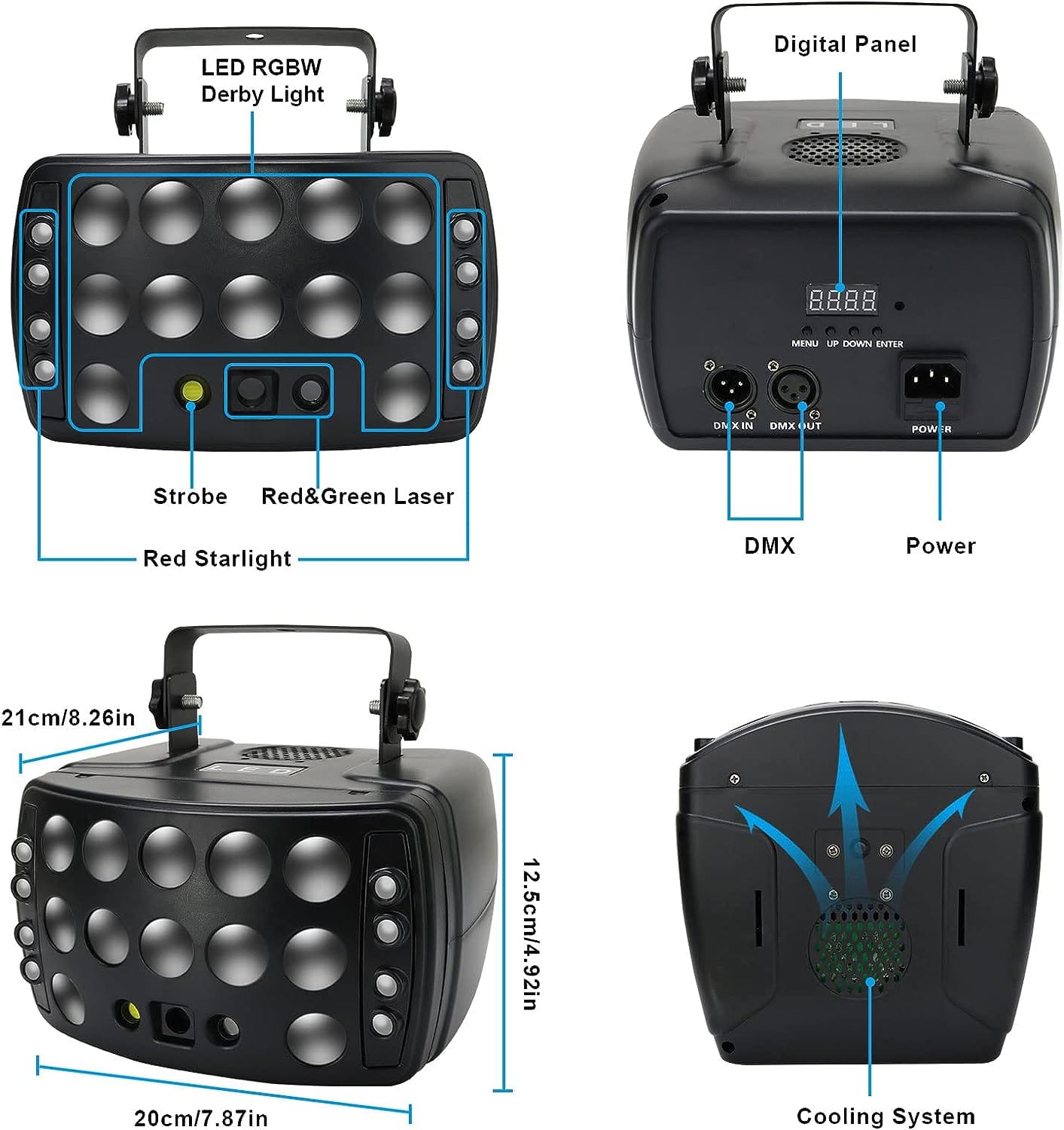 Con cuatro impresionantes efectos de iluminación en uno, incluyendo el efecto Derby, luz de patrones en rojo y verde, estroboscópico y luces de marquesina, tendrás más de 30 efectos de iluminación a tu disposición. Convierte tus eventos en algo mágico y dinámico con un solo foco.