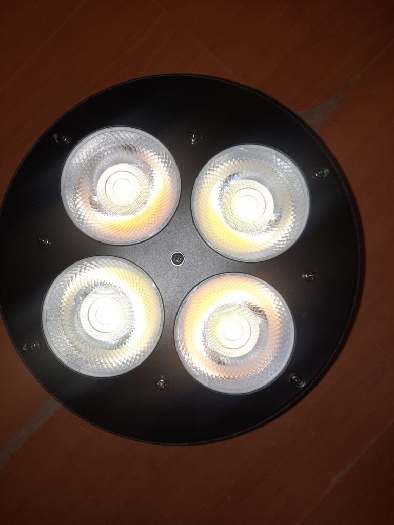 Sus 4 LEDs COB de 50W cada uno (200W en total) permiten alternar entre blanco cálido y blanco frío, adaptándose a diversas necesidades de iluminación, ya sea decorativa, funcional o escénica.