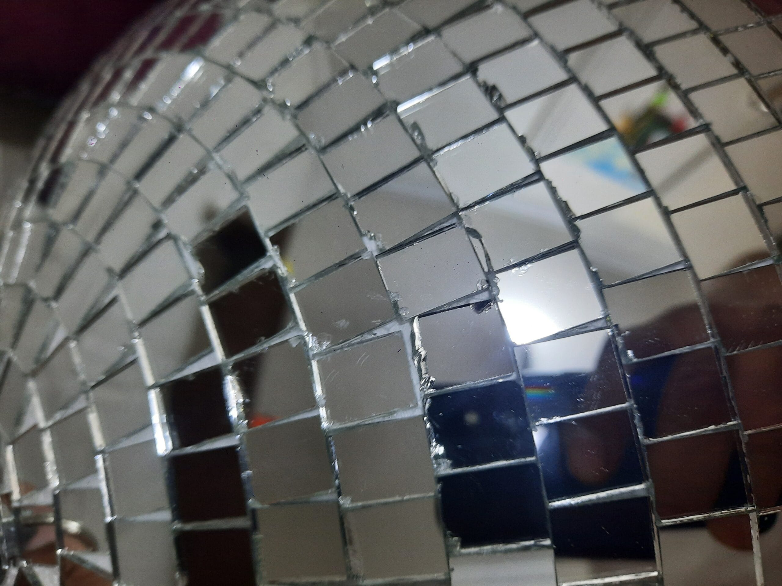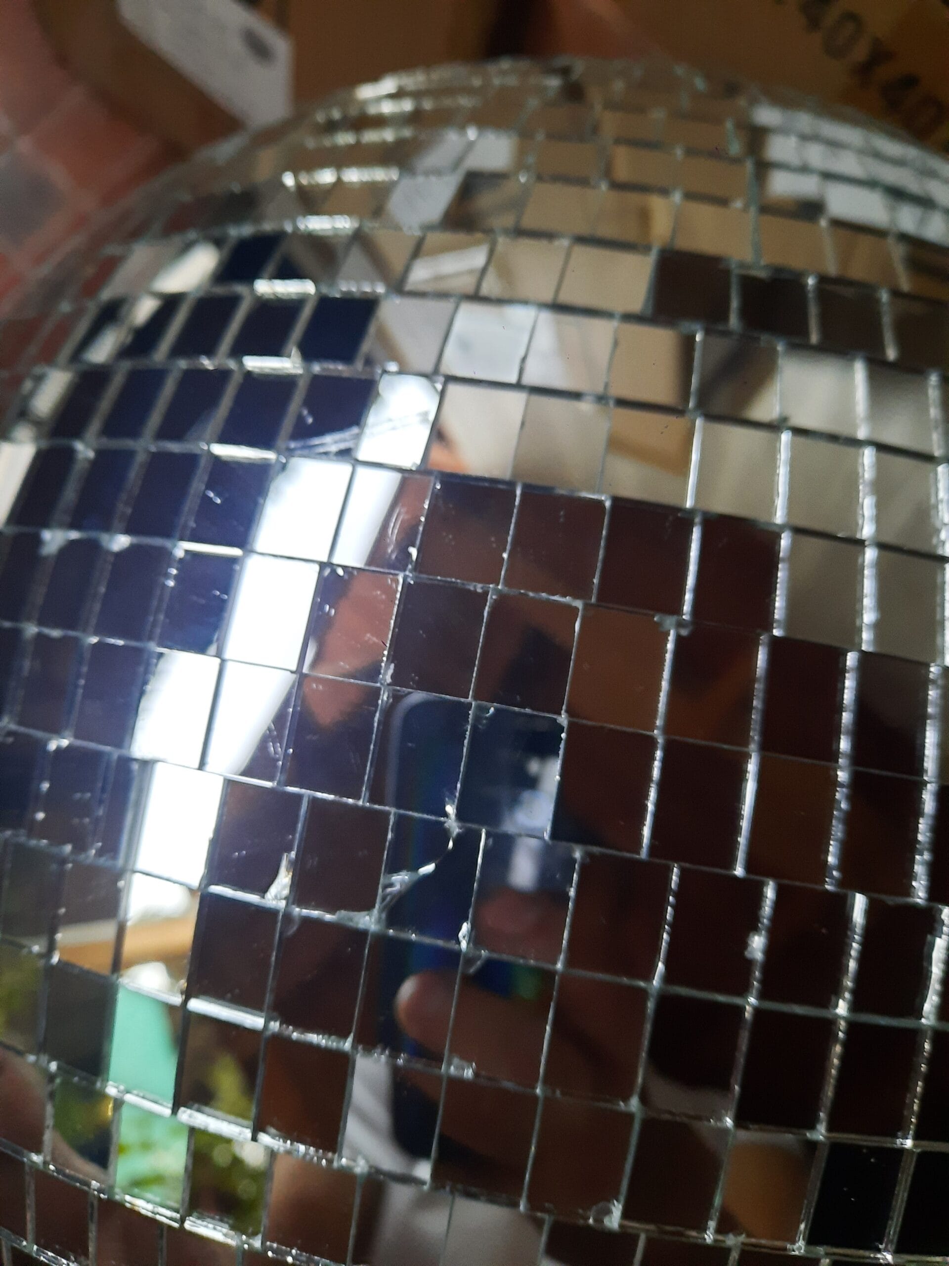 Bola disco de espejos de 40 cm en categoría segunda selección. Presenta detalles estéticos en los bordes de algunos espejos, pero el funcionamiento y el reflejo de luz son 100% normales. Ideal para fiestas en casa y eventos con presupuesto ajustado.